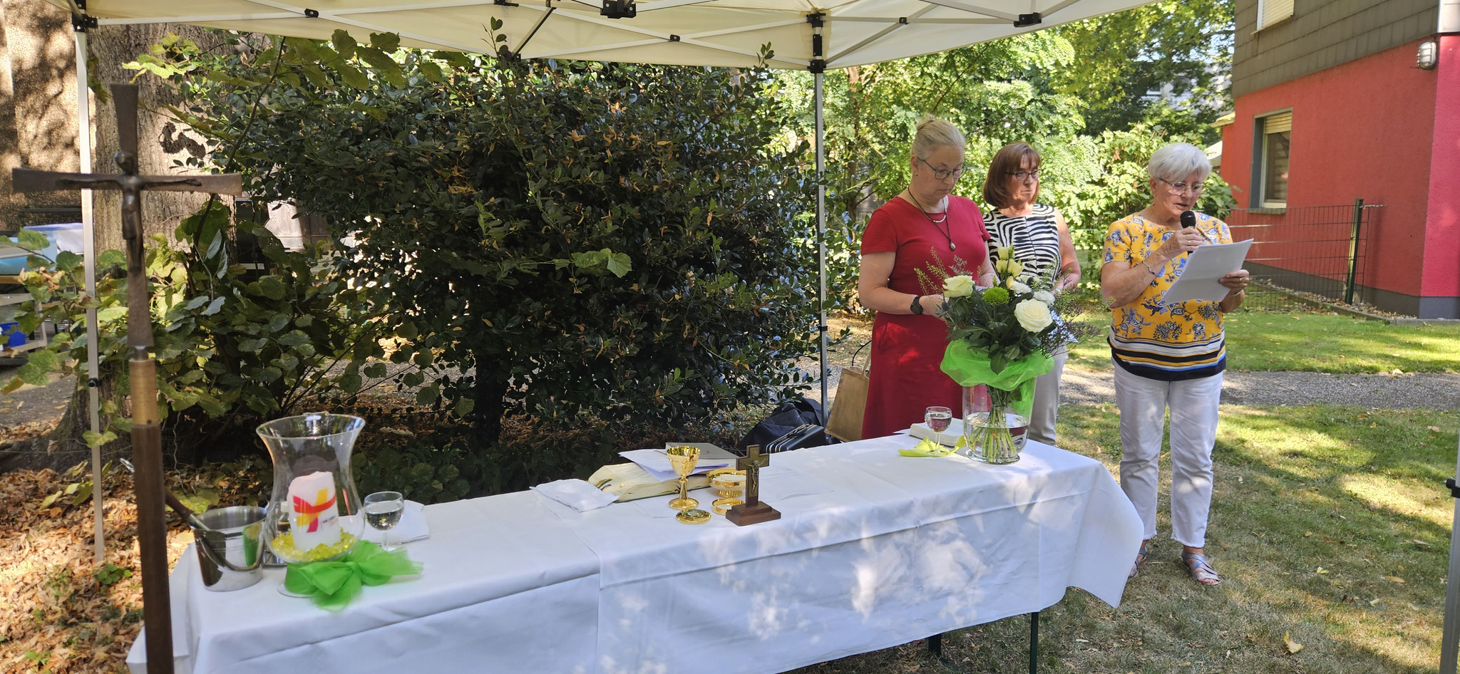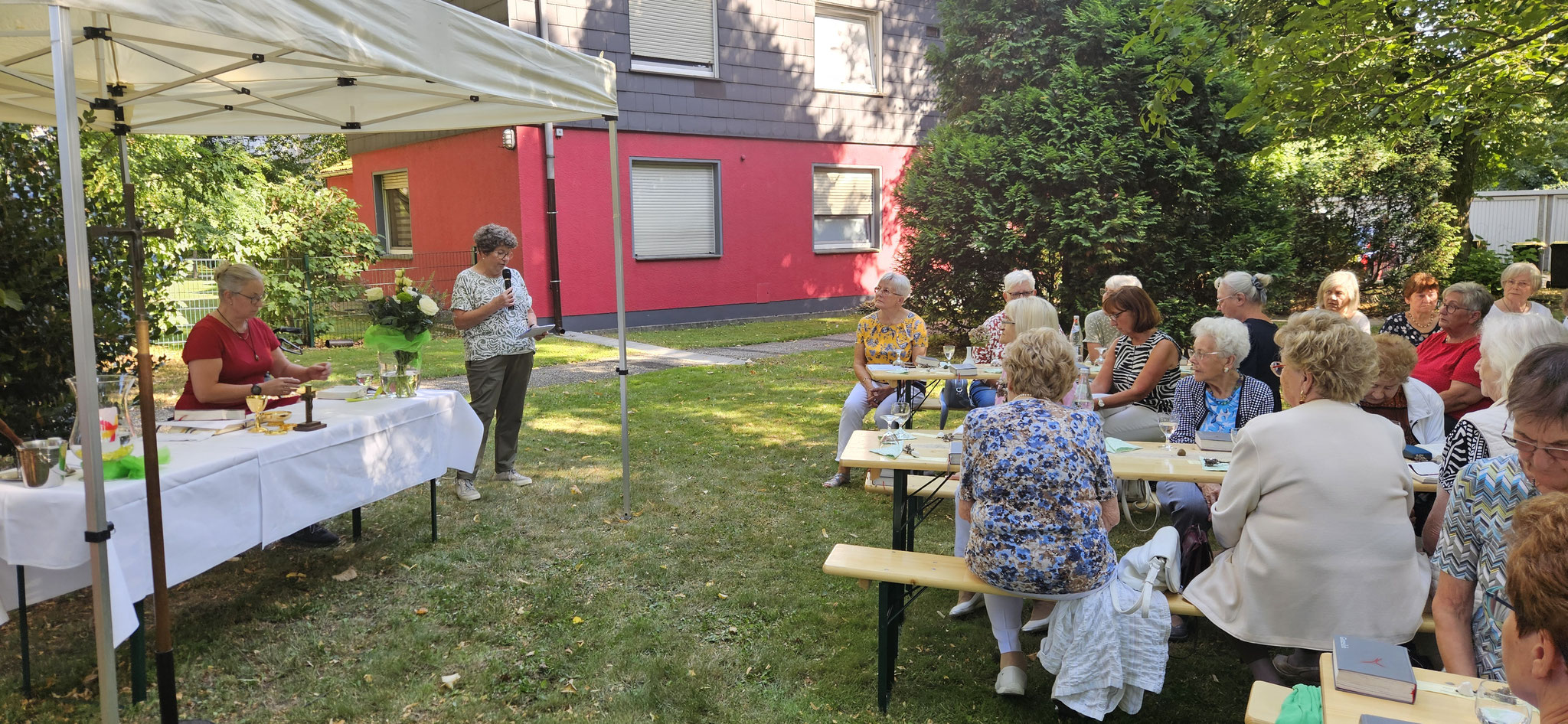 Etwa 40 Frauen der Katholischen Frauengemeinschaft Deutschlands (kfd) feierten am Montag, 18. August 2025, um 17 Uhr ihre traditionelle Sommermesse im Grünen neben dem Schmidthorster Dom. Bei sommerlichen Temperaturen und in einer besonders stimmungsvollen Atmosphäre stand der Gottesdienst unter dem Leitwort nach Theodor Fontane: „An einem Sommermorgen, da nimm den Wanderstab“.